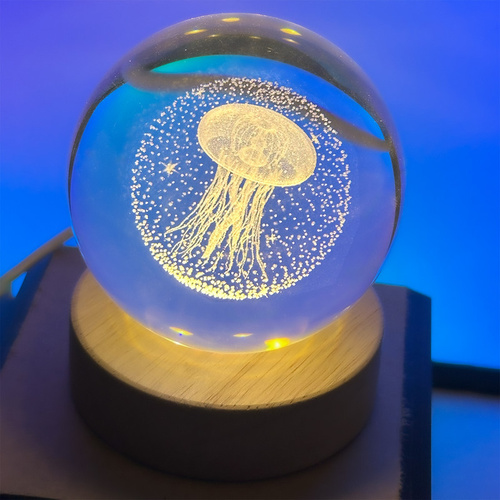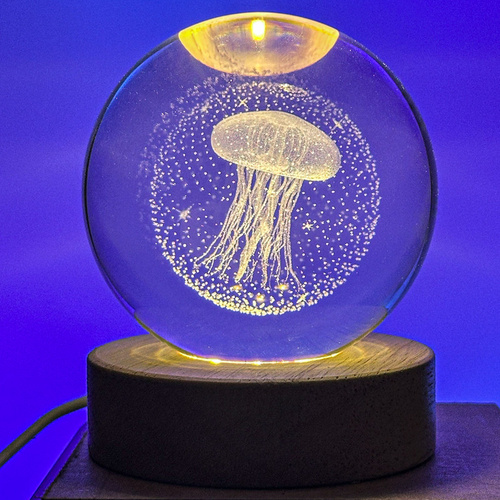 این چراغ خواب کریستالی به صورت سه بعدی و در طرح عروس دریایی تولید شده که باعث جذابیت بیشتر اتاق خواب شما می شود. جنس این گوی شیشه ای از کریستال فشرده می باشد و همچنین دارای یک پایه چوبی و کابل برق USB می باشد که امکان اتصال به لپ تاپ، کامپیوتر، پاور بانک و شارژ گوشی را فراهم میسازد. این محصول دکوری منحصر به فرد و شیک و همچنین یک هدیه جذاب و ماندگار برای هر شخصی می تواند باشد.